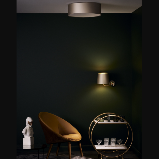 Niewielki odstęp abażura od sufitu daje ciekawy efekt delikatnej aureoli, a magnetyczne mocowanie materiałowego klosza do metalowego talerza mocowanego do sufitu, umożliwia łatwy demontaż i wygodne czyszczenie wnętrza lampy.