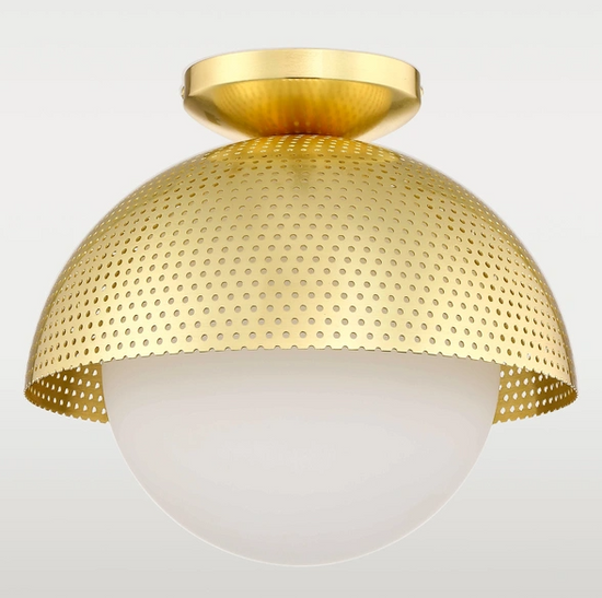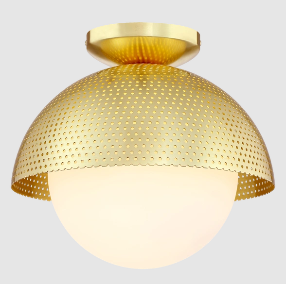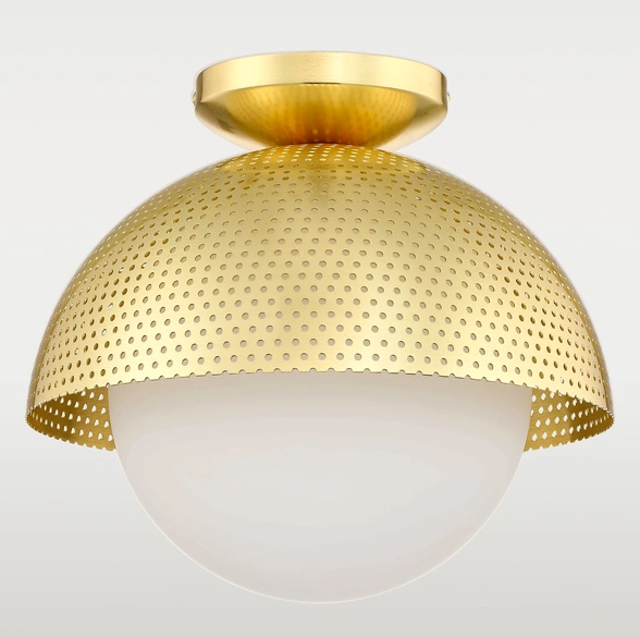 Plafon "Modena": elegancka prostota, szczotkowany mosiądz, perforowany metal, mleczny klosz, nowoczesny akcent do wnętrz.