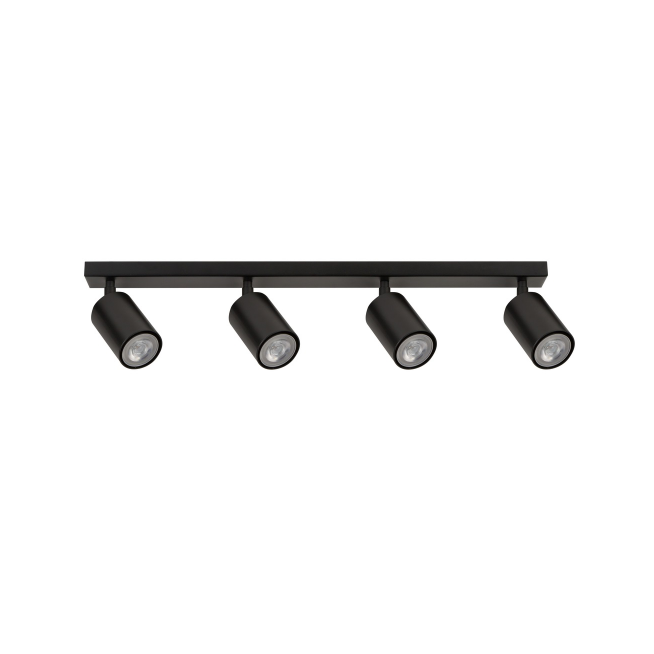 - Czarne reflektory sufitowe na szynie. Oświetlenie punktowe z ruchomymi kloszami. Model z 4 punktami świetlnymi.
