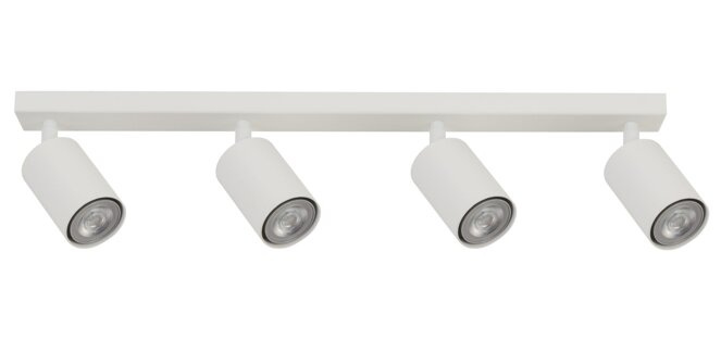 - Białe reflektory sufitowe na szynie. Oświetlenie punktowe z ruchomymi kloszami. Model z 4 punktami świetlnymi.