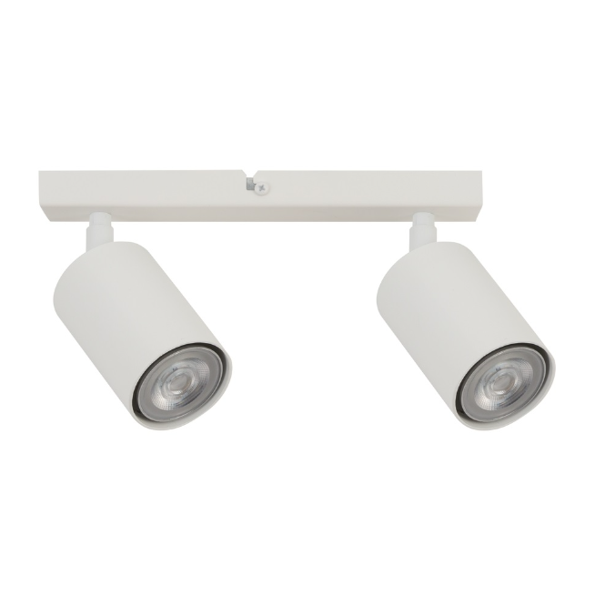 • Białe reflektory sufitowe na szynie. Oświetlenie punktowe z ruchomymi kloszami. Model z 2 punktami świetlnymi.