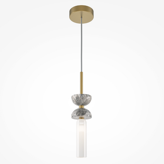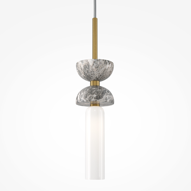 - Wisząca lampa z serii Kyoto z metalową i marmurową oprawą oraz mlecznym kloszem.