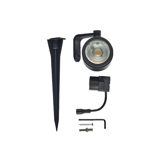 Ten mały reflektor jest dostarczany ze wspornikiem i kołkiem uziemiającym. Długość kabla w tej oprawie wynosi 60 cm.