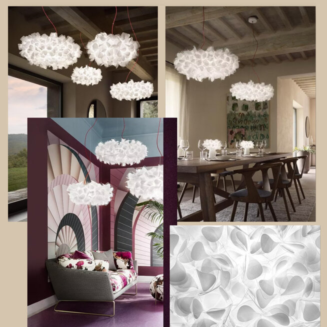 Clizia to seria kształtów, które pasują do siebie, tworząc idealną równowagę odbić i przezroczystości. Lampa nawiązuje do naturalnych form, przypominających chmurę, która łapie pierwsze zmieniające się promienie porannego słońca, lub wierzchołek drzewa filtrujący grę światła i cienia. Wszystkie dostępne wersje łączą estetykę z funkcjonalnością, charakteryzując się systemem magnetycznym, łączącym je z sufitem (w przypadku zawieszeń i aplikacji). Clizia przekształca przestrzeń w krajobraz, nie przytłaczając jej.