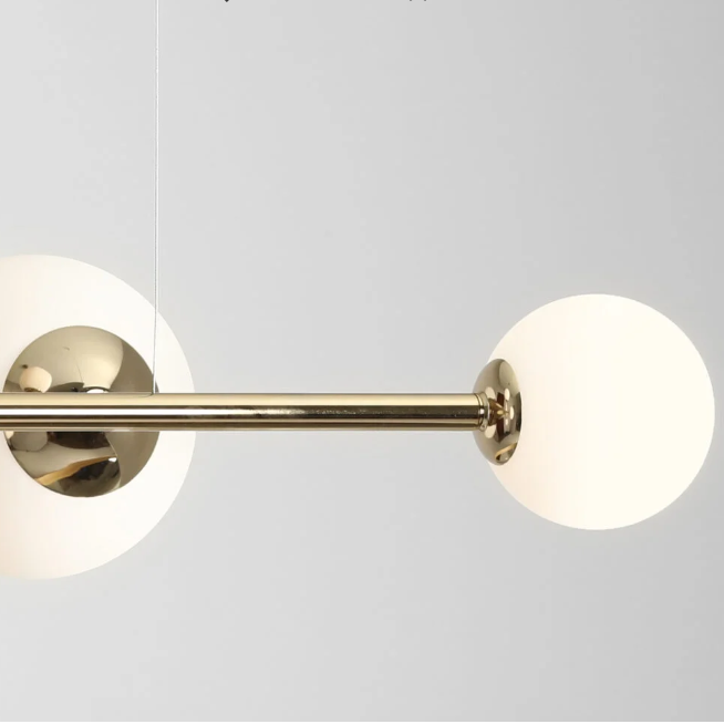 Lampa Dione to złota lampa z 9 mlecznymi okrągłymi kloszami.