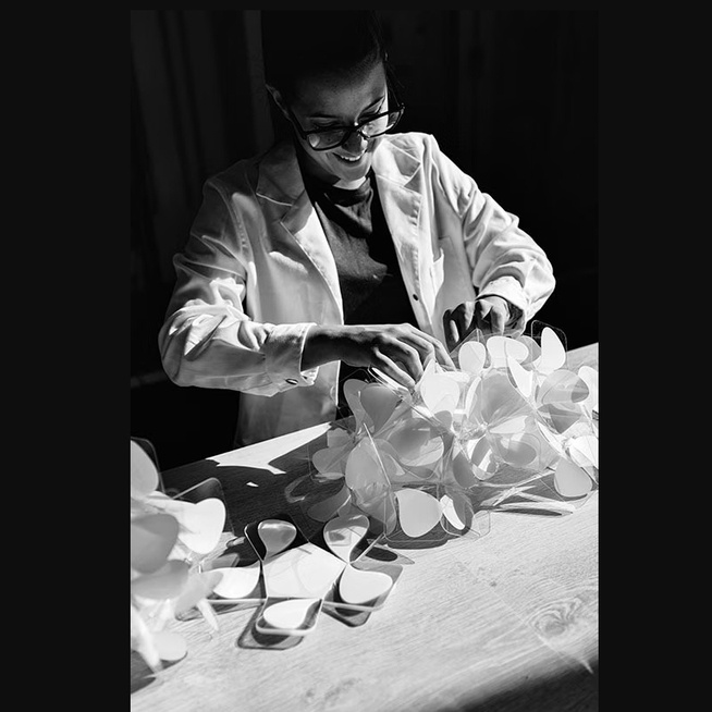 Seria Clizia Mama Non Mama to wyjątkowe połączenie radości, kobiecości i pierwotnej czystości uczuć - delikatne „płatki” Cristalflex®, ręcznie składane w systemie zakładek, tworzą świetlisty bukiet, który wnosi do wnętrza lekkość i subtelną elegancję.