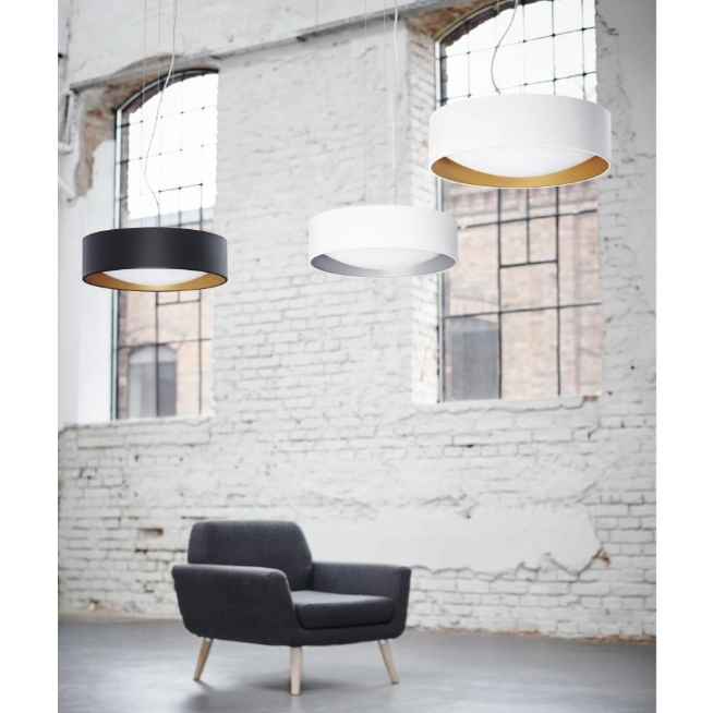 Ta lampa wisząca o długości 45 cm została wykonana z matowej stali w kolorze czarnym. Wnętrze stalowej obręczy delikatnego kontrastuje z białym, szklanym kloszem, który pokrywa trzy źródła światła.