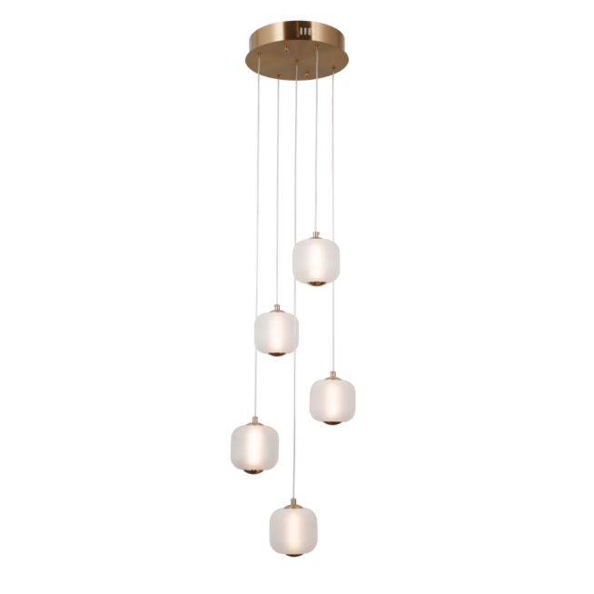 - Lampa wisząca Italux to elegancka kompozycja pięciu opalowych kloszy, które subtelnie rozpraszają światło, tworząc przytulną atmosferę. Złote wykończenie lampy dodaje jej luksusowego charakteru, doskonale komponując się z wieloma aranżacjami wnętrz.