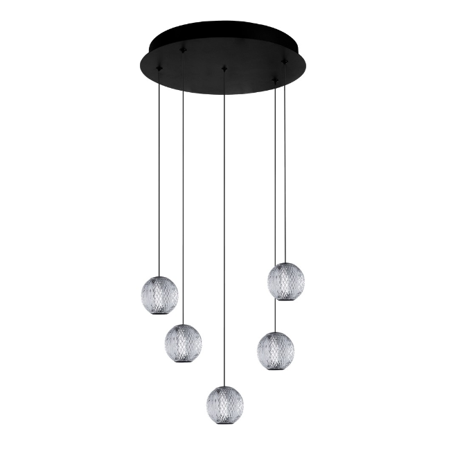 Lampa wisząca Edem 5 Round to połączenie współczesnej estetyki i wyrafinowanego stylu. Pięć subtelnie wykonane szklane klosze zawieszone są na okrągłej, czarnej podstawie, tworząc harmonijną kompozycję. Jej unikalny wygląd dodaje wnętrzu luksusowego charakteru, a jednocześnie zachowuje minimalistyczny urok.