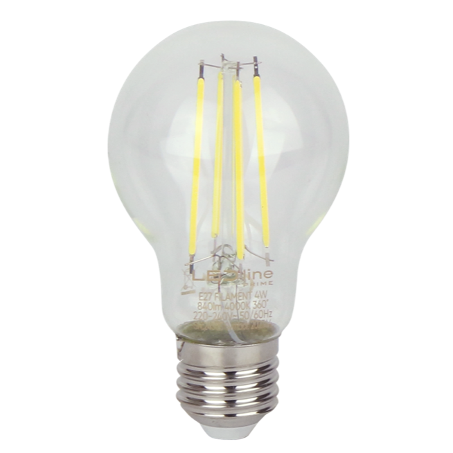 - Żarówka LED E27 7W 4000K 1470lm FILAMENT A60 marki LED line PRIME łączy nowoczesny design, energooszczędność (210 lm/W) i trwałość (40 000 godzin), emitując równomierne, neutralne światło (4000 K) idealne do różnorodnych wnętrz.