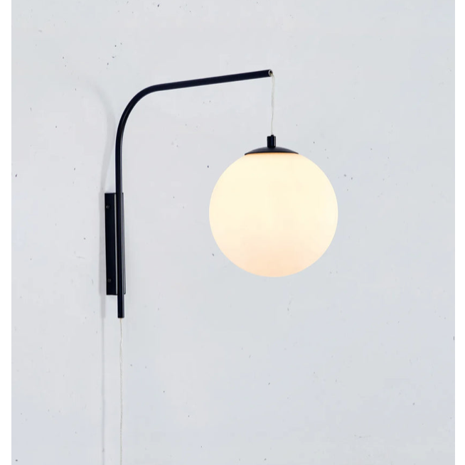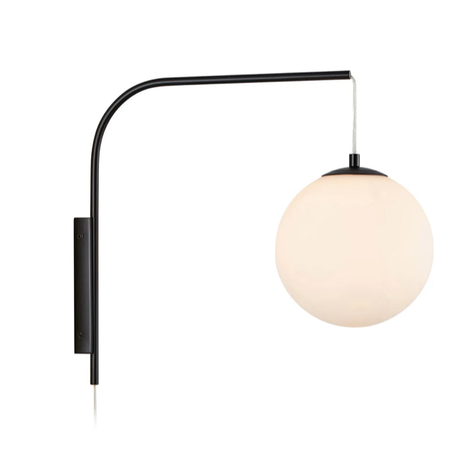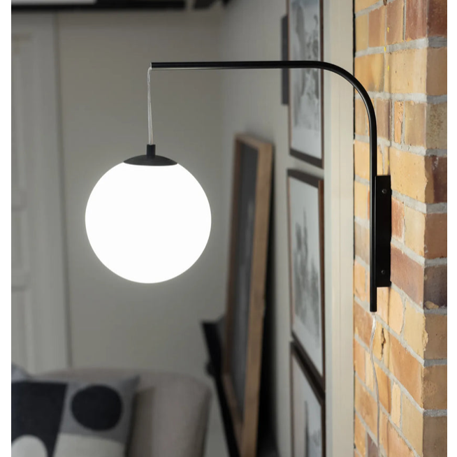 - Kinkiet Dione, z matową czarną podstawą, opalowym kloszem na przezroczystym kablu i 40 cm wysięgiem, to elegancki dodatek idealnie uzupełniający inne lampy z serii Dione.