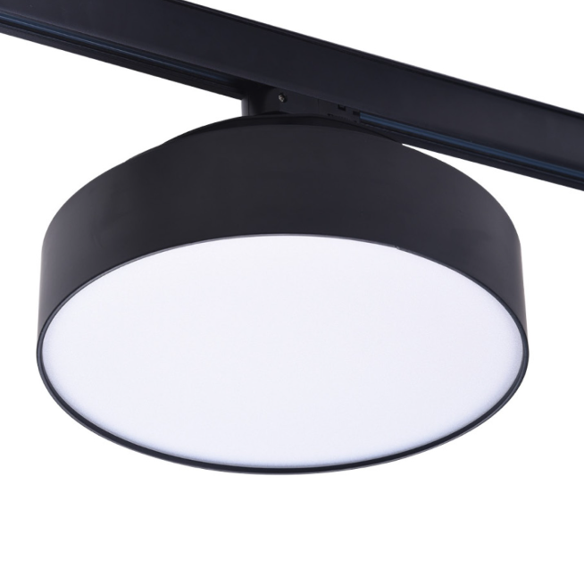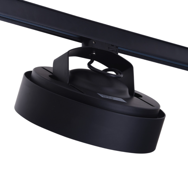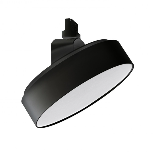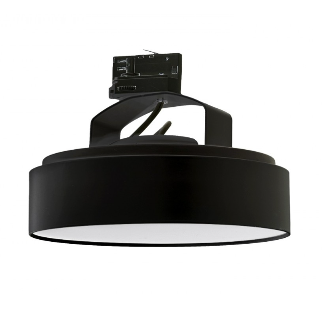 Lampa składa się z szerokiego, metalowego pierścienia w kolorze czarnym, w którym znajduje się zintegrowane źródło światła LED. Mlecznobiała akrylowa tafla osłania je od spodu, subtelnie rozpraszając światło. Całość mocowana jest do szynoprzewodu za pomocą regulowanej podstawki.