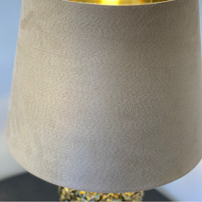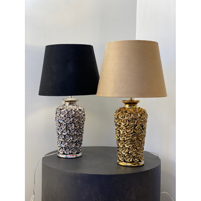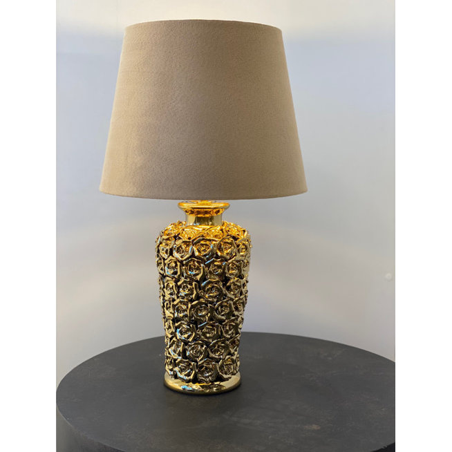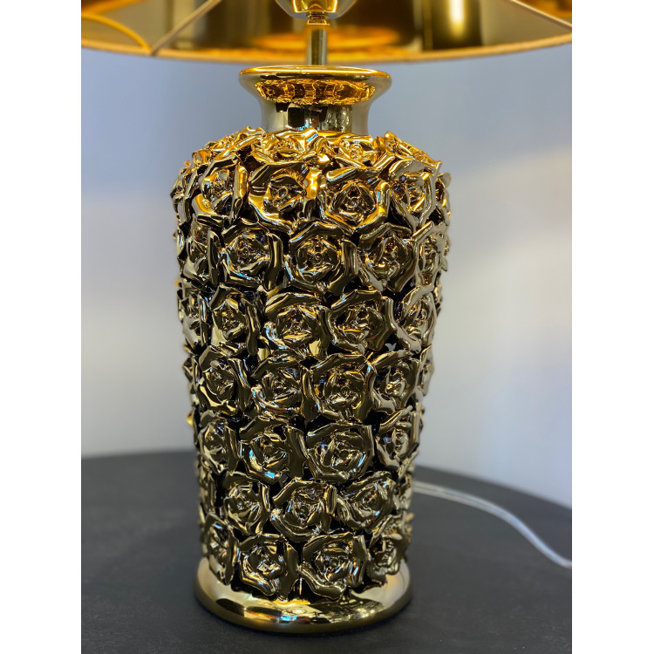 Rozprzestrzenianie róż - podstawa tej lampy jest bogato ozdobiona błyszczącymi, złocistymi płatkami różanych kwiatów. Ściśle ulokowane małe płatki otaczają podstawę lampy i są oświetlone przez źródło światła umieszczone pod czarnym welurowym abażurem. Beżowy abażur tłumi blask żarówki i zapewnia nieoślepiające światło. Ciekawe wzornictwo lampy sprawia, że jest stanowi istotny element dekoracyjny.