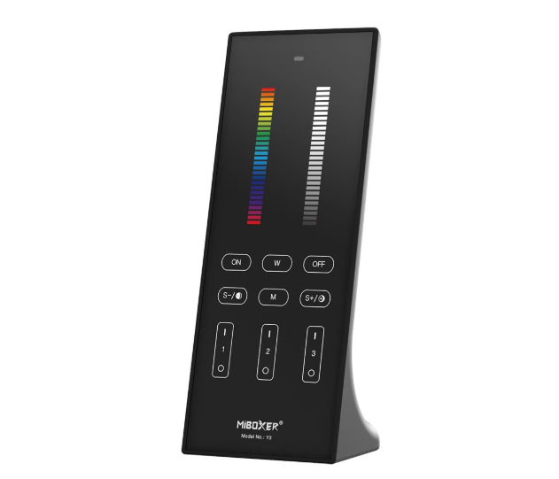 Y3 to pionowy pilot do kontrolera RGB+CCT z matowego szkła, odpornego na zarysowania i odciski palców. Wyposażony w technologię 2.4GHz, zapewnia szybkie i stabilne sterowanie bez zakłóceń. Idealny do regulacji jasności, temperatury barwowej, kolorów RGB, nasycenia, trybów dynamicznych i prędkości, sprawdzi się w oświetleniu domowym, hotelowym i komercyjnym.