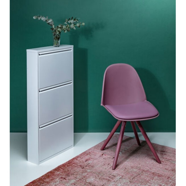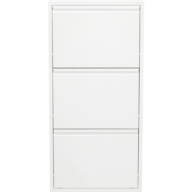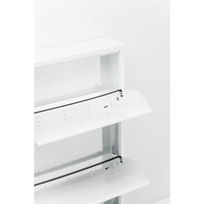 Ten oryginalny mebel wykonany został z blachy stalowej. Szafka posiada trzy wychylane przedziały na obuwie.