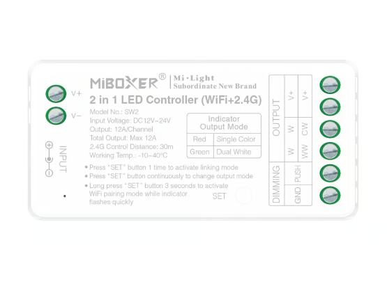 Kontroler LED SW2 to doskonałe rozwiązanie dla osób poszukujących nowoczesnego, łatwego w obsłudze i rozbudowanego sterownika do systemów oświetleniowych CCT i MONO. Jego funkcje, takie jak modulacja PWM, WiFi oraz repeater, sprawiają, że jest to niezawodny wybór dla osób ceniących wygodę i efektywność.