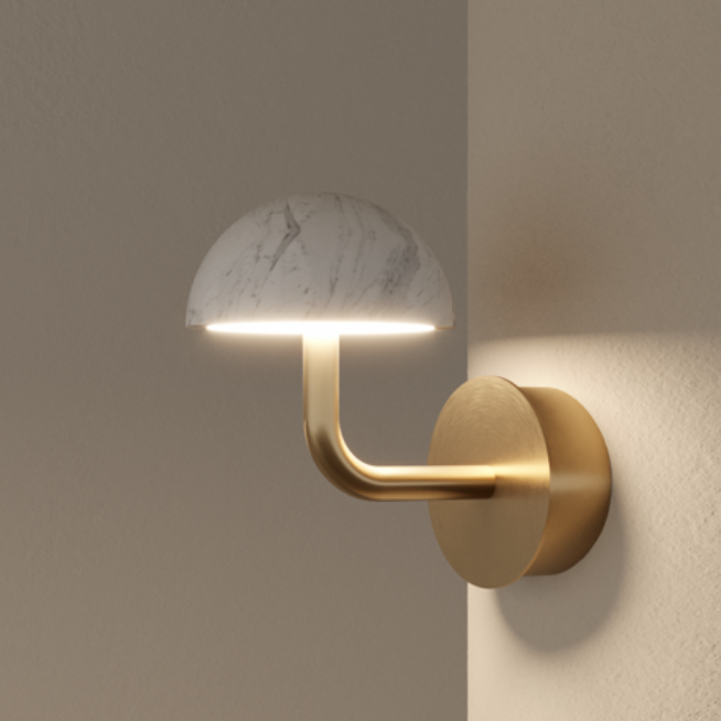 Lampa ma zaoblony, marmurowy klosz, światło jest skierowane w dół, rozproszone.