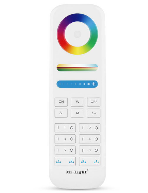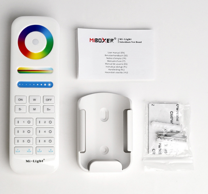 - MiBoxer 6-strefowy pilot RGB+CCT 2.4GHz to dotykowy kontroler do sterowania oświetleniem LED, umożliwiający zmianę kolorów, jasności i temperatury barwowej.