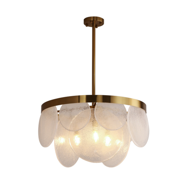 Szklane elementy żyrandola AURORA są półprzezroczyste, dzięki czemu światło, które przez nie przechodzi, jest delikatnie rozproszone, tworząc ciepłą i przytulną atmosferę.