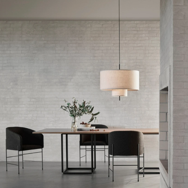 Miękka tkanina abażurów kontrastuje z ich czystą, graficzną formą, tworząc wyrazistą sylwetkę, która dodaje wnętrzu obecności i głębi. Wyważone proporcje oraz dopracowane detale – jak liniowy element konstrukcyjny – podkreślają estetykę serii i wydobywają unikalny charakter opraw Margin.