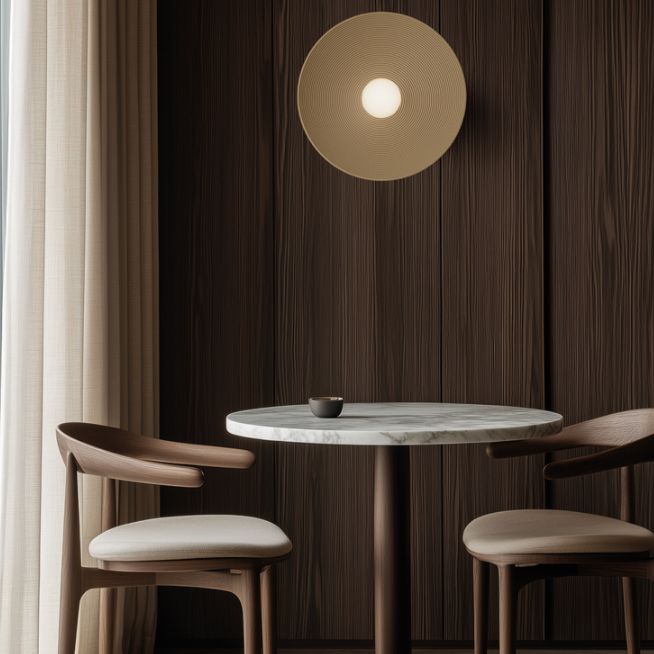 Forma opiera się na płytce o średnicy 35 lub 50 cm, z wyraźną teksturą koncentrycznych rowków, nadających głębię i grę światła–cienia. Centralne źródło - żarówka G9 LED (5 W, 2700 K, 450 lm) - emituje ciepłe, przytulne światło. Kinkiet jest ściemnialny i posiada wbudowany wyłącznik ON/OFF.