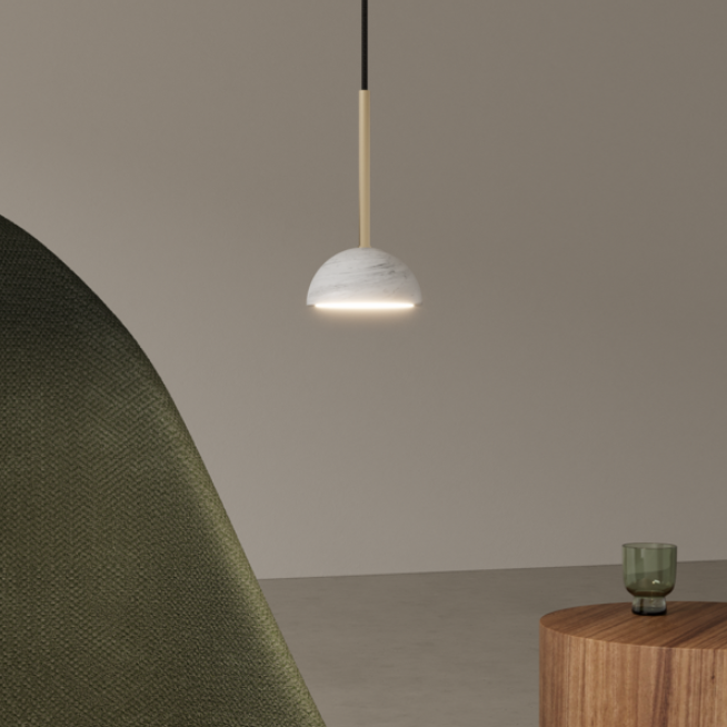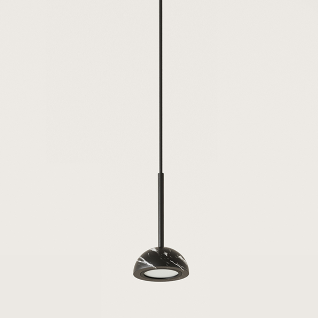 Lampa Dussa to elegancka oprawa o minimalistycznym, ale wyrafinowanym charakterze. Jej istotą jest półkolisty klosz z naturalnego kamienia (białego, czarnego), zawieszony na smukłej, stalowej konstrukcji. To połączenie masywności kamienia z delikatnością formy tworzy efekt wizualnego kontrastu i harmonii.