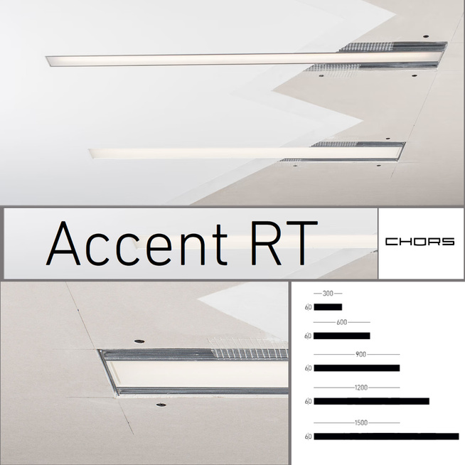 Acceent RT przeznaczony jest do projektów, gdzie potrzeba jest duża ilość światła. Dostępne opcje ściemniania, różne przesłony oraz barwy światła pozawalają na zastosowanie w najbardziej wymagających projektach. Po zamontowaniu uzyskuje się efekt świecącej linii. Przeznaczony jest do pomieszczeń, w których występuje sufit podwieszany z płyt gipsowych o grubości 12 mm. Nie nadaje się do montażu w sufitach akustycznych ani innych płytach sufitowych.