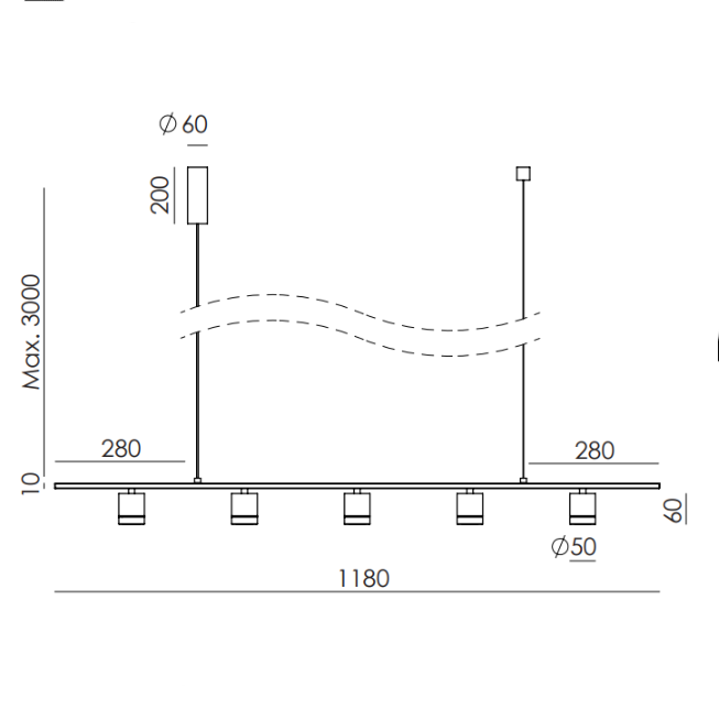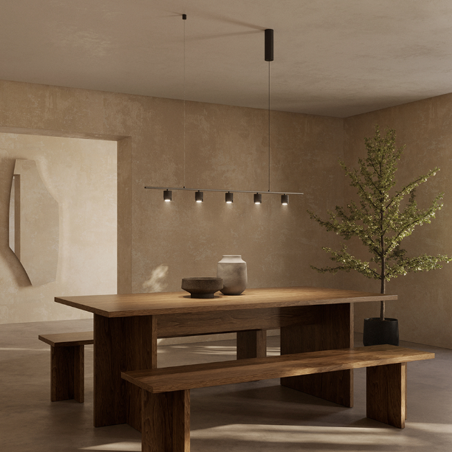 Lampa wisząca Tea C1337/5 od Aromas del Campo to efektowny i nowoczesny projekt oświetlenia sufitowego, który łączy minimalistyczną formę z wysokiej jakości materiałami, tworząc elegancki akcent we wnętrzu. Projekt stworzony przez AC Studio dla hiszpańskiej marki Aromas del Campo wyróżnia się prostą, liniową konstrukcją o szerokości około 118 cm, na której zawieszono pięć cylindrycznych źródeł światła LED, równomiernie rozmieszczonych na smukłym profilu.