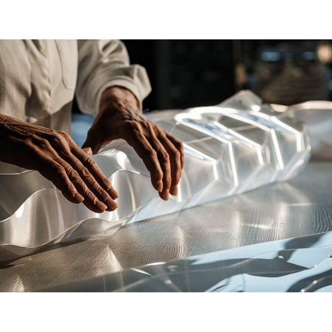 LENFLEX jest materiałem wytwarzanym w specjalnym procesie produkcji sprawiającym, że jego powierzchnia jest wielopłaszczyznowa, tak jakby był wykonany z wielu małych pryzmatów. Dzięki nakładaniu dwóch warstw materiału o przeciwnym nachyleniu o 0,15°, Lentiflex jak woda, zmienia swój wygląd i kolor w zależności od punktu obserwacji. Materiał pozwala na uzyskanie efektu soczewki Fresnela, umożliwiając przenikanie światła przy jednoczesnym skierowaniu go ku dołowi. Pozwala to zmaksymalizować jasność uzyskiwaną dzięki żarówkom energooszczędnym, LED lub halogenowym, tworząc efekt opalizujących kolorów likwidując jednocześnie efekt oślepiania.