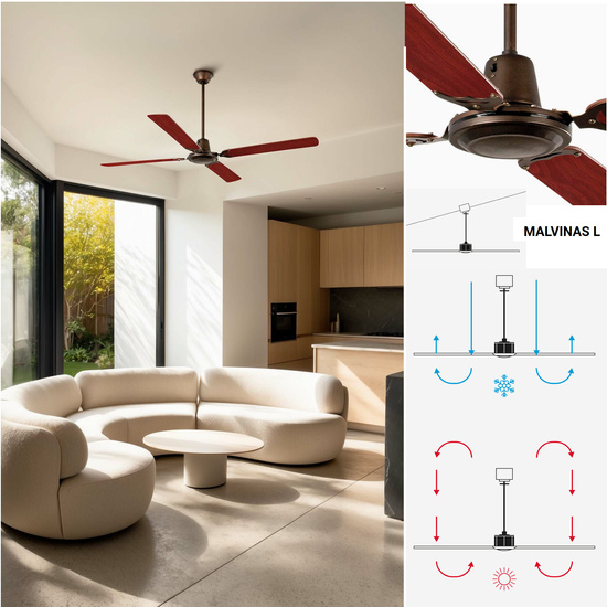 Dzięki funkcji rewersu możesz zmienić kierunek łopatek wentylatora i używać go zarówno latem, jak i zimą. Latem pomoże uzyskać chłodną atmosferę, a zimą poprawi wydajność systemu grzewczego, powodując cyrkulację gorącego powietrza gromadzącego się w suficie