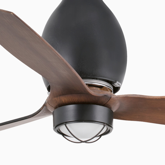 MINI ETERFAN to wentylator sufitowy z oświetleniem o industrialnym i nowoczesnym stylu. Ten wentylator sufitowy jest idealny do wentylacji pomieszczeń o powierzchni od 13 do 17'6m² i ma silnik DC o niskim zużyciu energii. Ma 6 regulowanych prędkości. Ten matowo-czarny wentylator z drewnianymi łopatkami ma funkcję rewersyjną lato-zima, dzięki czemu można go używać również zimą, zwiększając wydajność systemu grzewczego. Aktywowany za pomocą dołączonego pilota.